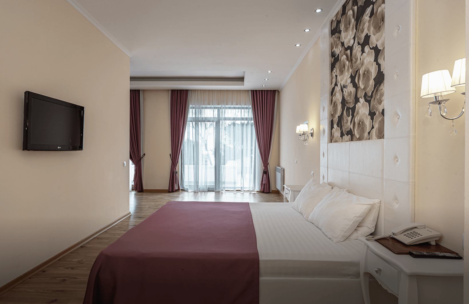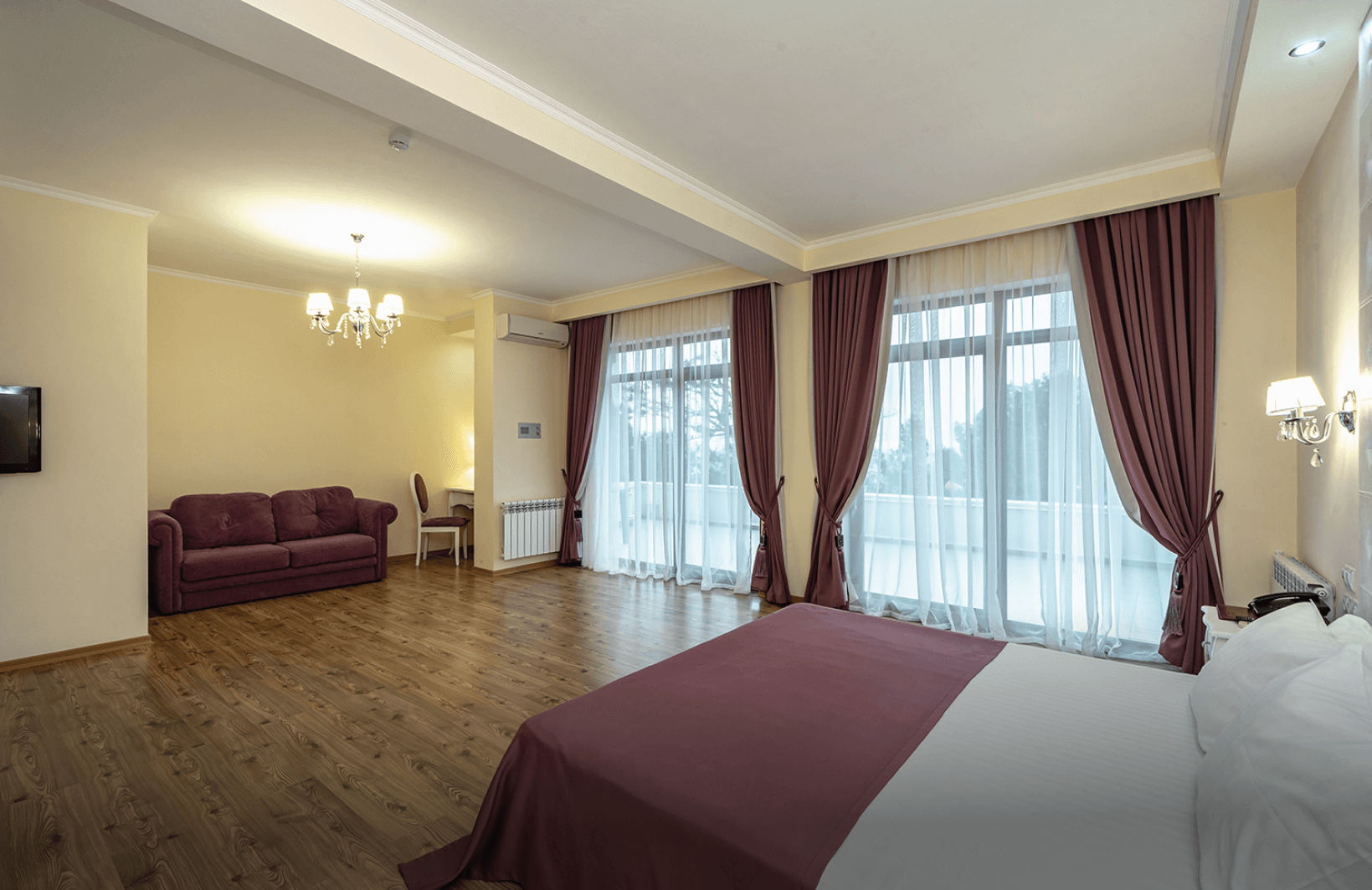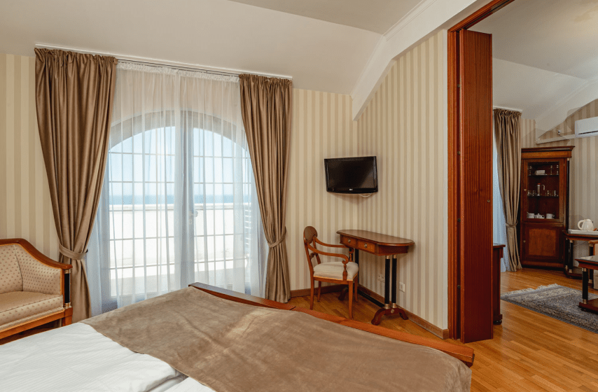 Люкс площадью 60 квадратных метров на пятом этаже третьего корпуса предлагает просторное однокомнатное пространство с двуспальной кроватью, парой прикроватных тумбочек, туалетным столиком и вместительной гардеробной. Раскладной диван обеспечивает дополнительное размещение двоих взрослых гостей. С балкона открывается панорамный вид на морскую гладь. Номер оснащён индивидуальным кондиционером, ламинированным полом, мини-баром, электрочайником, телефоном, сейфом и телевизором.