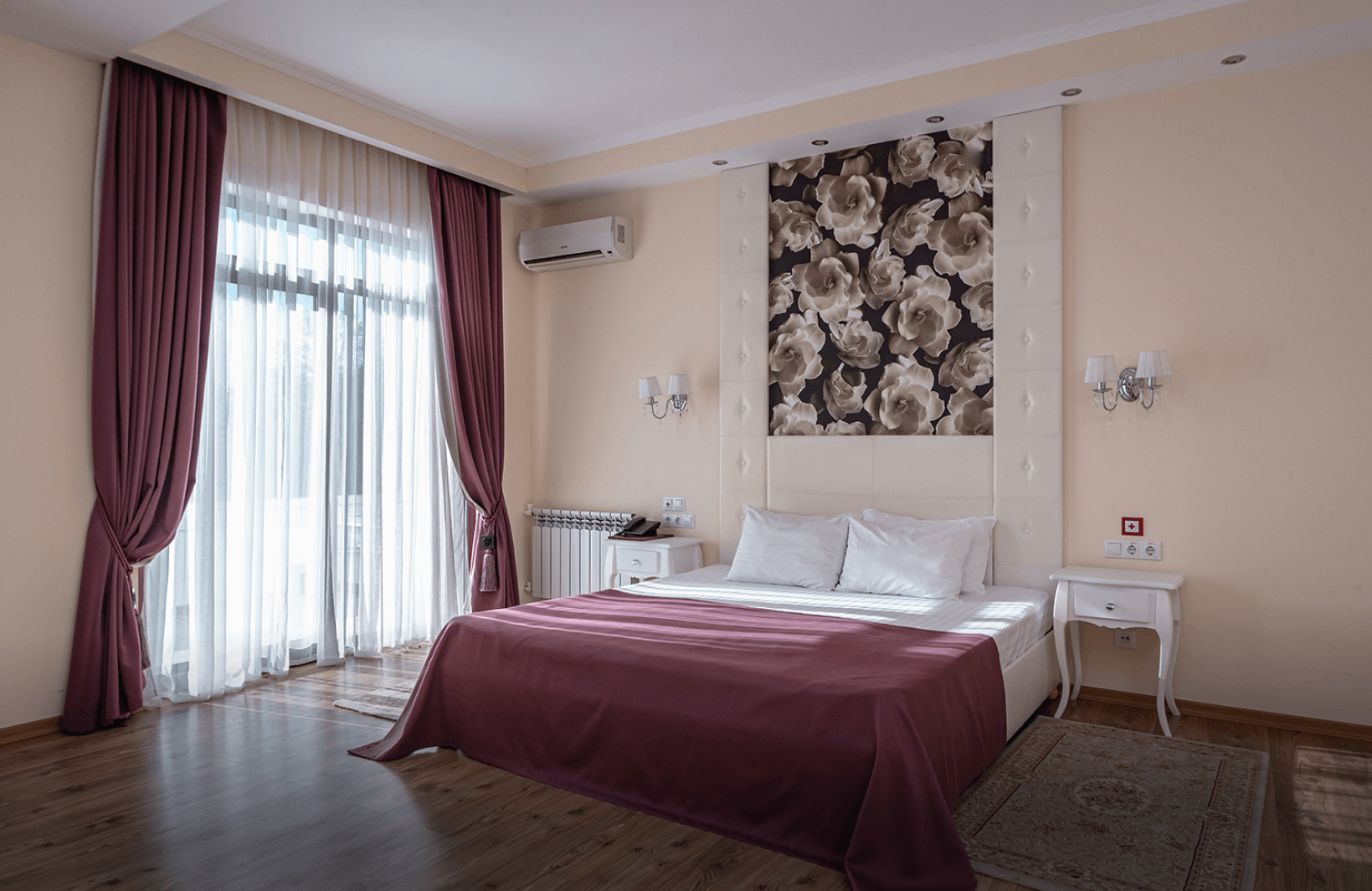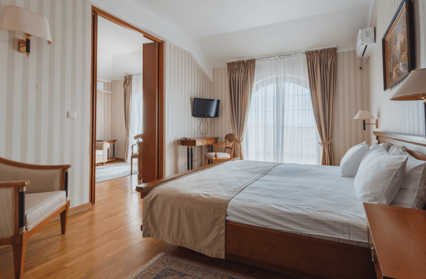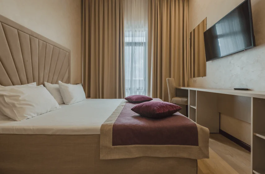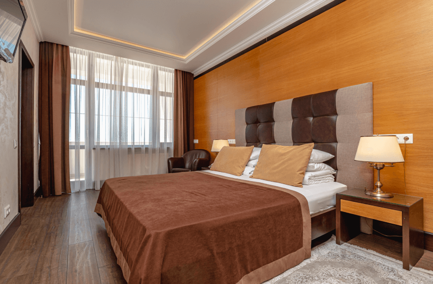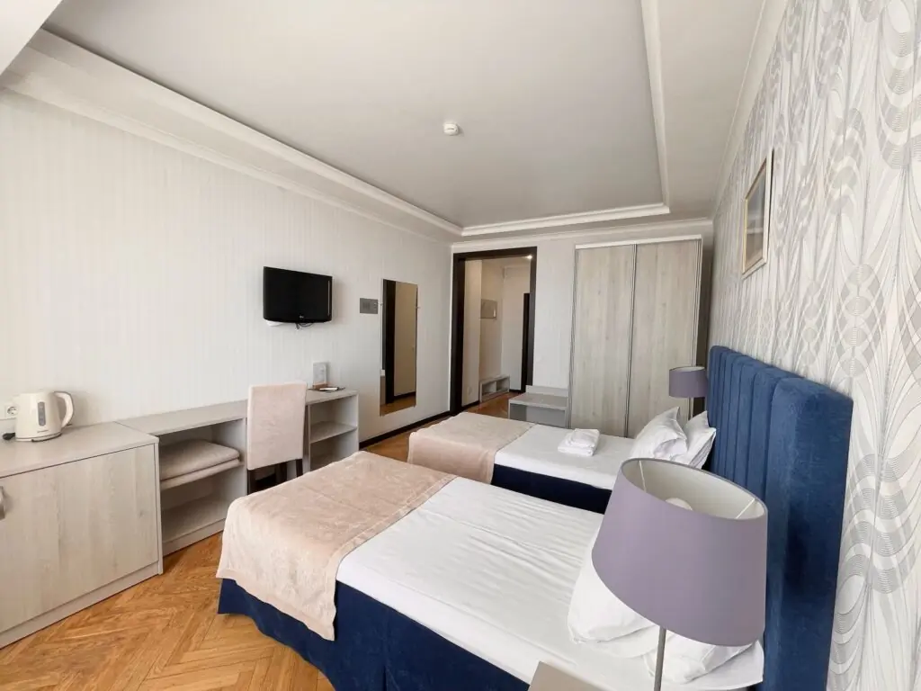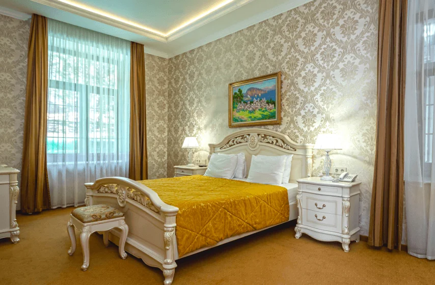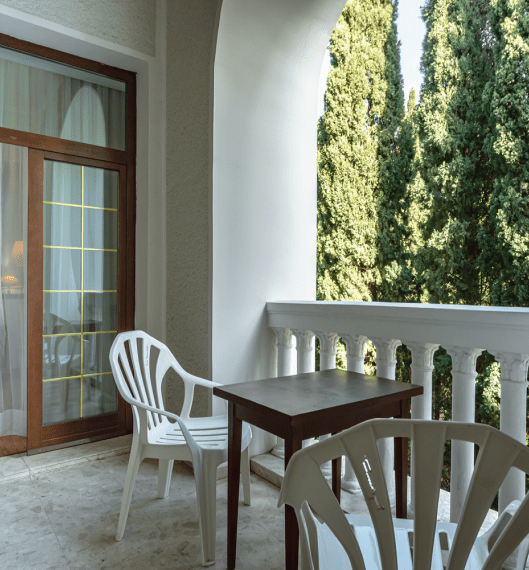 Категории полулюкс и люкс дополняются просторными балконами, с которых открываются живописные виды на горные массивы и территорию парка «Чаир». Номера отличаются увеличенной площадью и улучшенной планировкой, обеспечивающей дополнительное пространство для отдыха. Апартаменты категории «Сьют» представляют собой просторные помещения с повышенным уровнем комфорта, где каждая деталь интерьера продумана для создания атмосферы уюта и релаксации. Отделка номеров выполнена с использованием качественных материалов, а оснащение включает расширенный набор удобств для продолжительного пребывания.