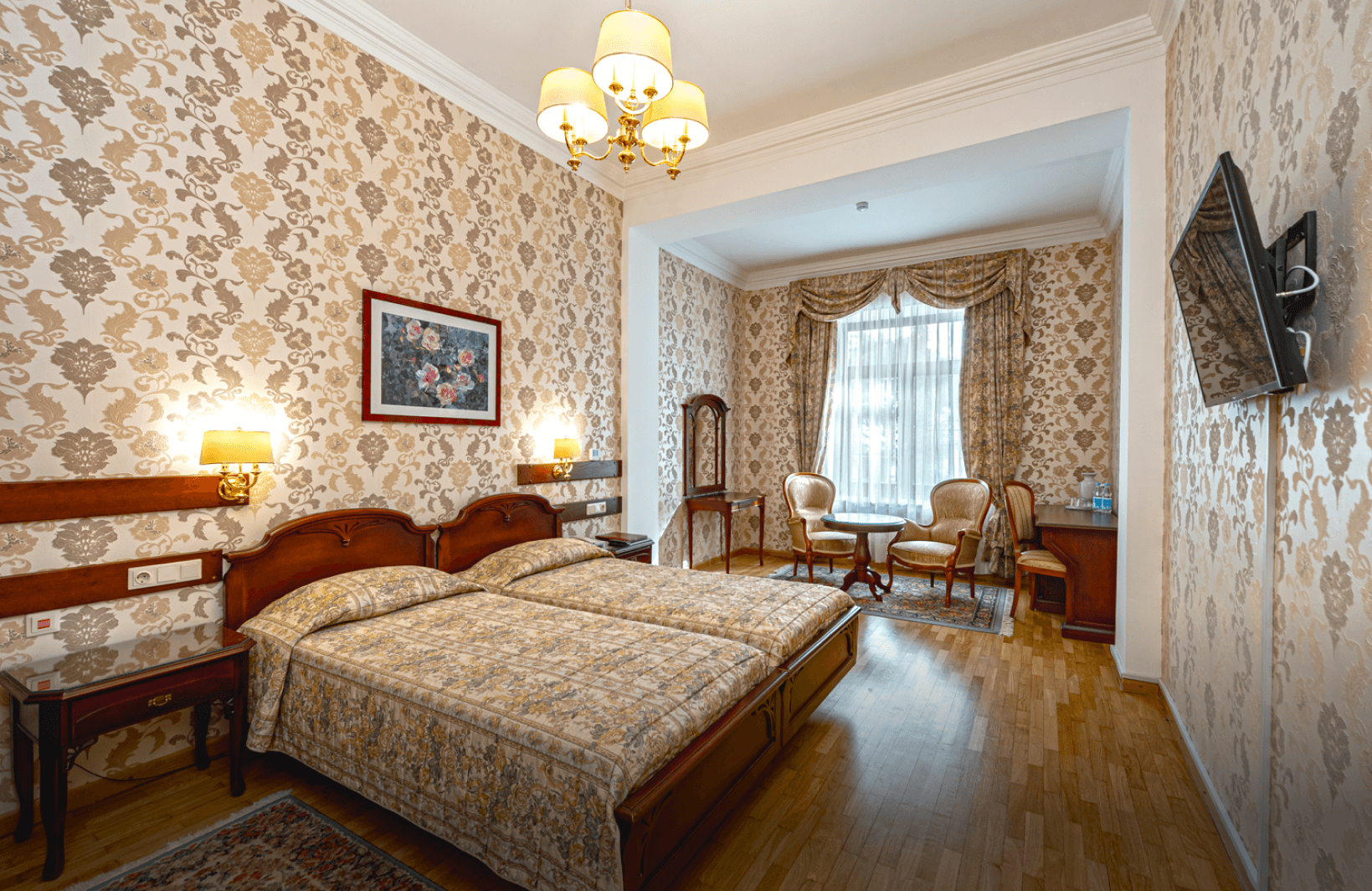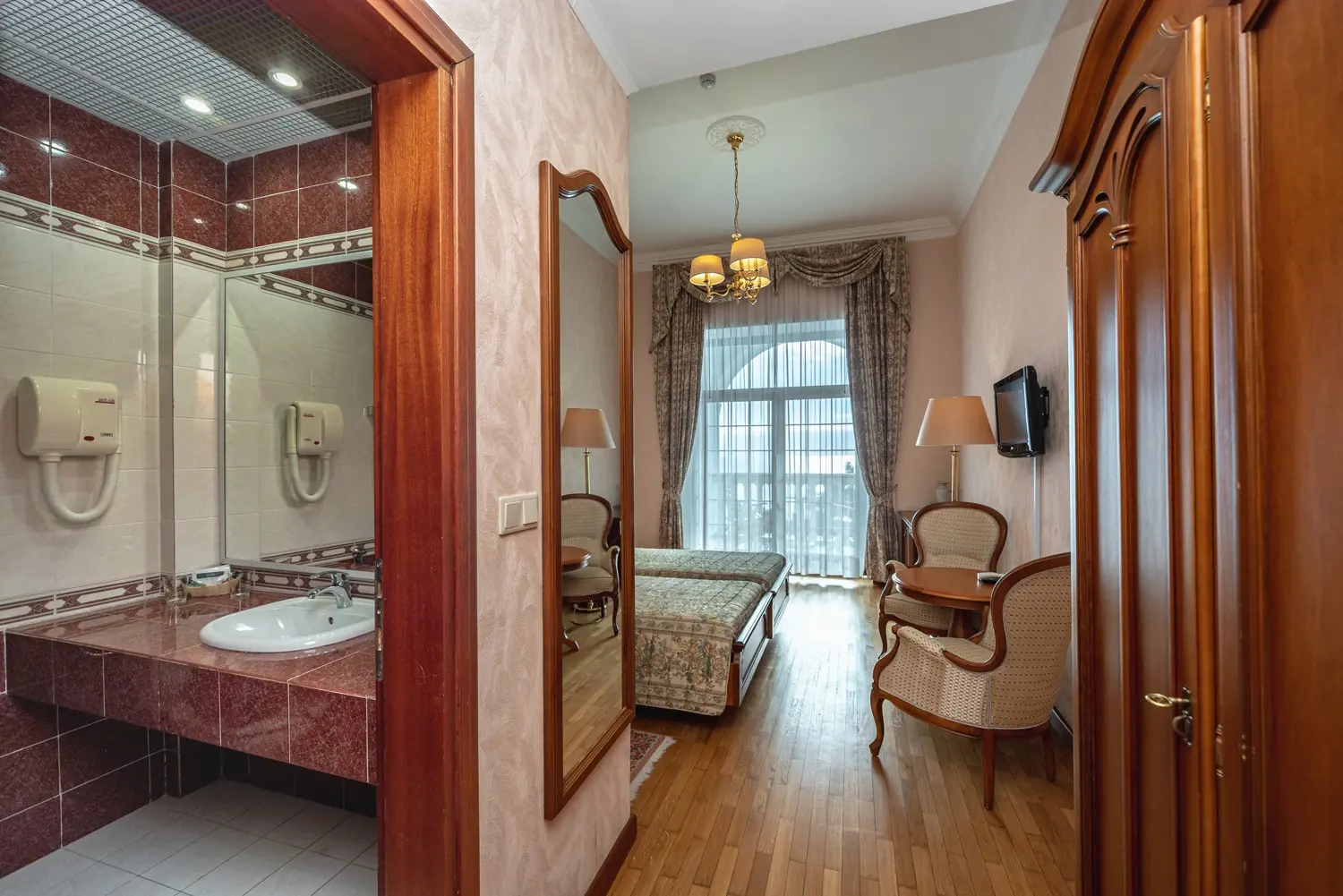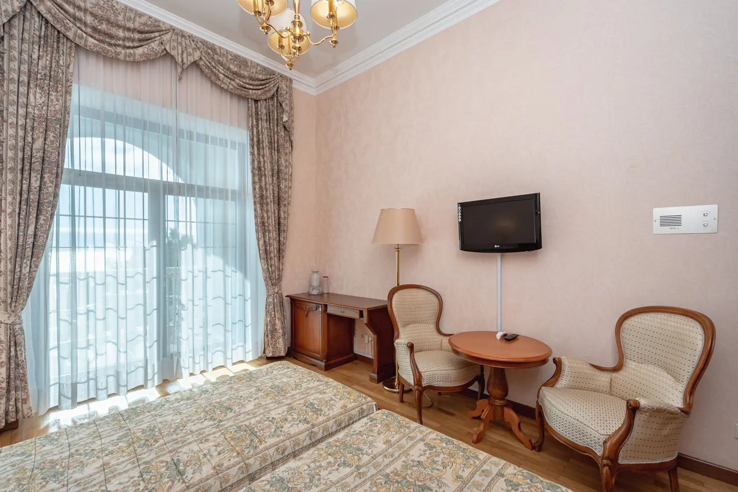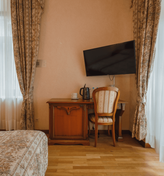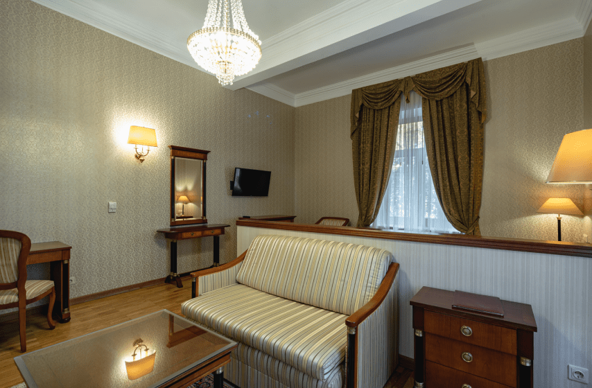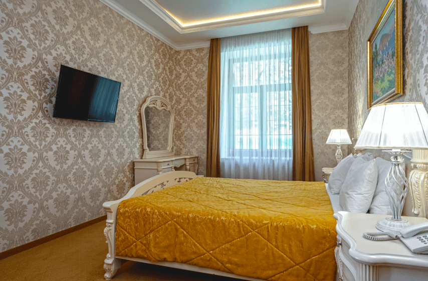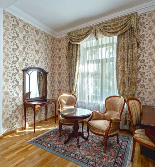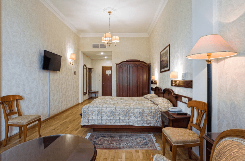 Просторный номер площадью 24 квадратных метра расположен на первом этаже первого корпуса и выдержан в элегантном винтажном стиле с использованием итальянской мебели. Две отдельные кровати, прикроватные тумбочки, туалетный и рабочий столы, платяной шкаф формируют функциональное пространство для размещения до четырёх гостей (дополнительно — евро-раскладушка). Окна южной ориентации открывают вид на парк «Чаир». Помещение оснащено центральным кондиционированием, паркетным полом, мини-баром, электрочайником, телефоном, жидкокристаллическим телевизором и радио; балкон отсутствует.