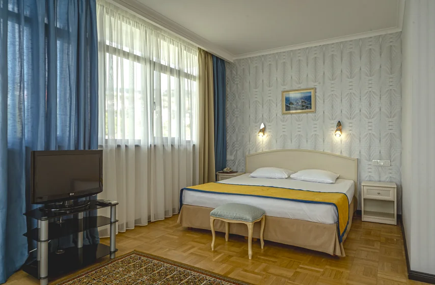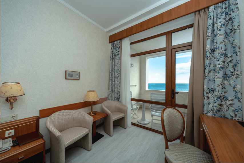 Просторный номер площадью 25 квадратных метров на втором этаже второго корпуса включает большую двуспальную кровать и раскладной диван, позволяя разместить до четырёх гостей. Мягкая мебель, кресло, прикроватные тумбочки, туалетный столик и вместительный платяной шкаф создают комфортную обстановку для отдыха. С балкона открывается панорама парка «Чаир» и морских просторов. Оснащение представлено индивидуальной системой кондиционирования, ламинированным полом, мини-баром, электрочайником, телефоном и жидкокристаллическим телевизором.