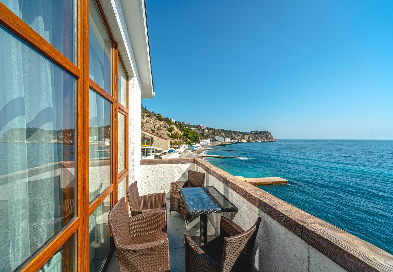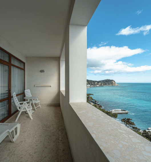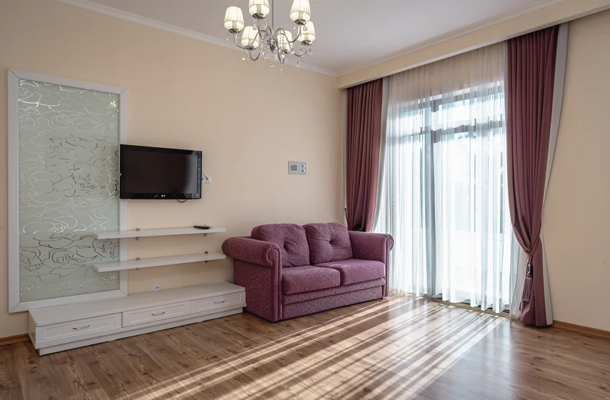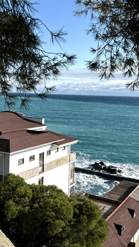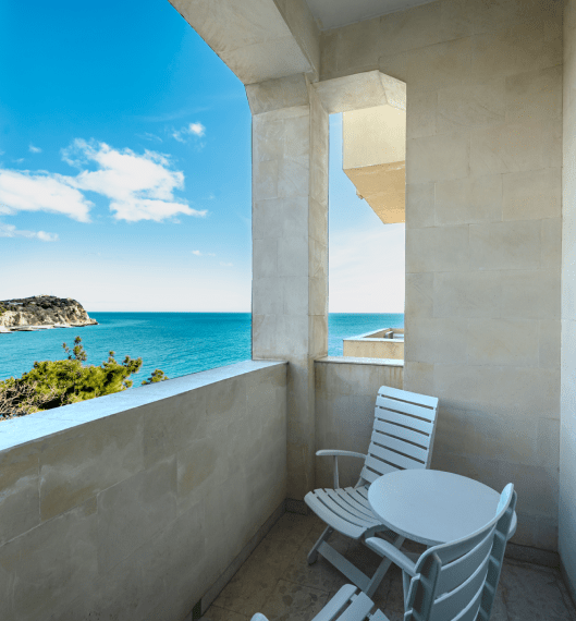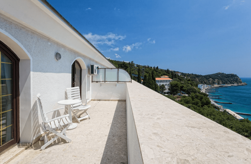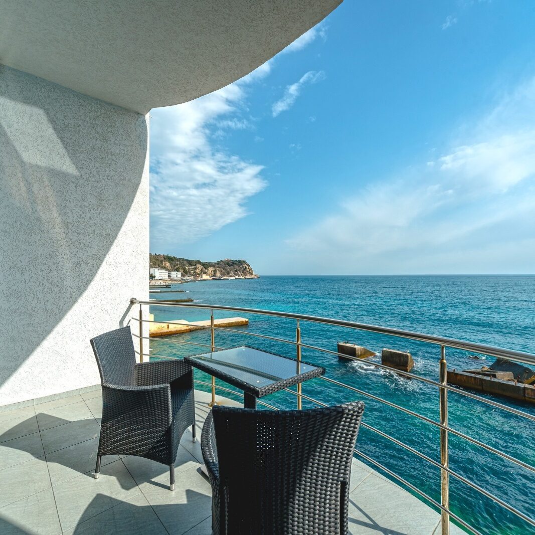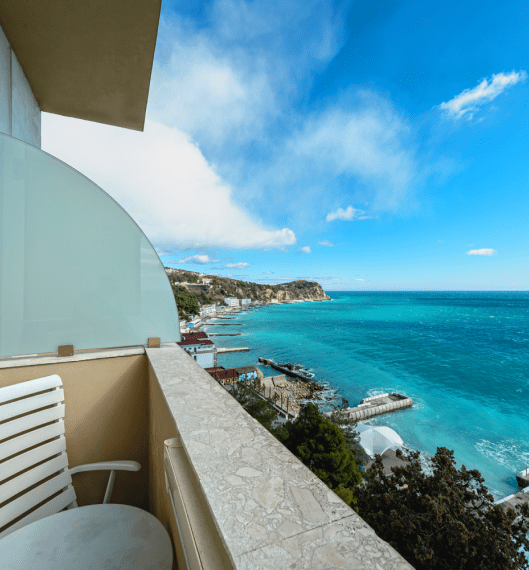 Люкс «Альбатрос» площадью 42 квадратных метра представляет собой двухкомнатное пространство, сочетающее уединение и функциональность для размещения до четырёх гостей. Отдельная спальня с двуспальной кроватью и гостиная зона с раскладным диваном (дополнительное место без возрастных ограничений) обеспечивают комфорт как для романтического отдыха, так и для пребывания небольшой семьи с детьми. Панорамные окна открывают вид на морскую гладь и живописный мыс Ай-Тодор, создавая атмосферу гармонии и спокойствия в течение всего дня. Продуманная планировка номера позволяет каждому гостю наслаждаться личным пространством без ущерба для общего комфорта проживания.