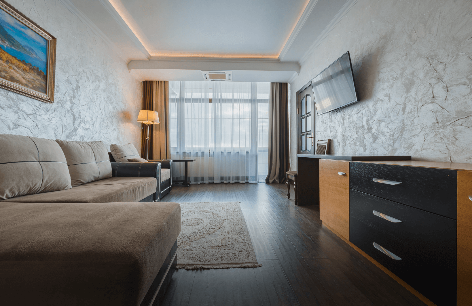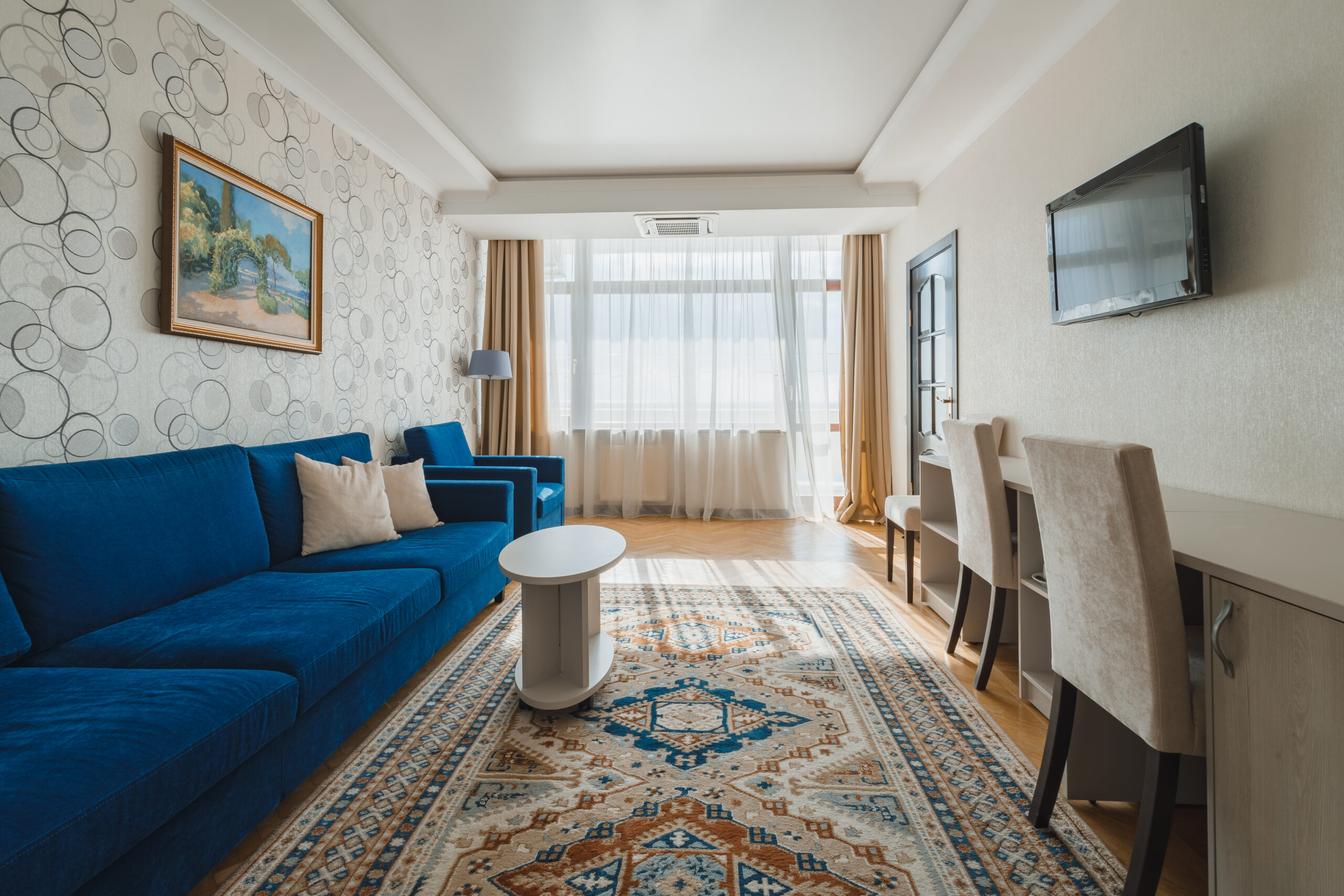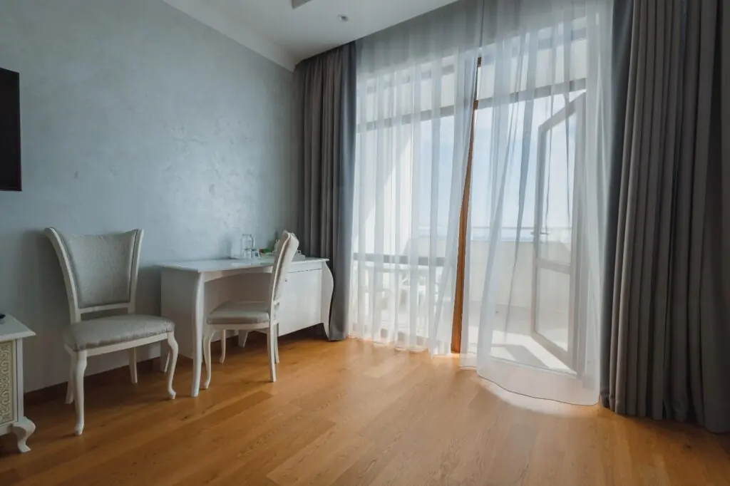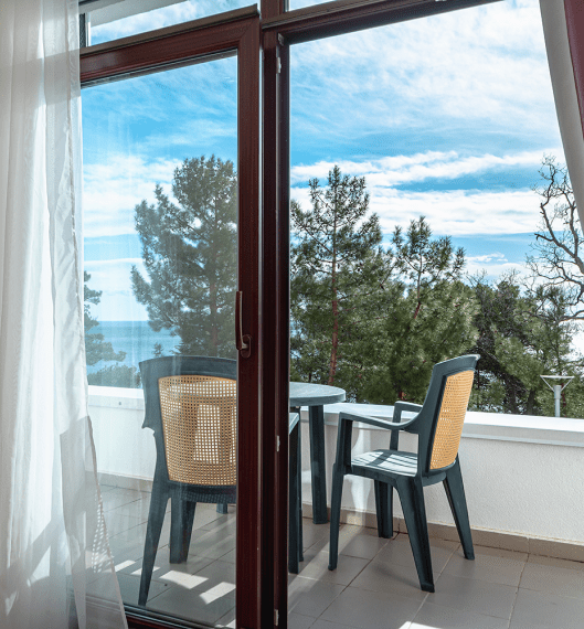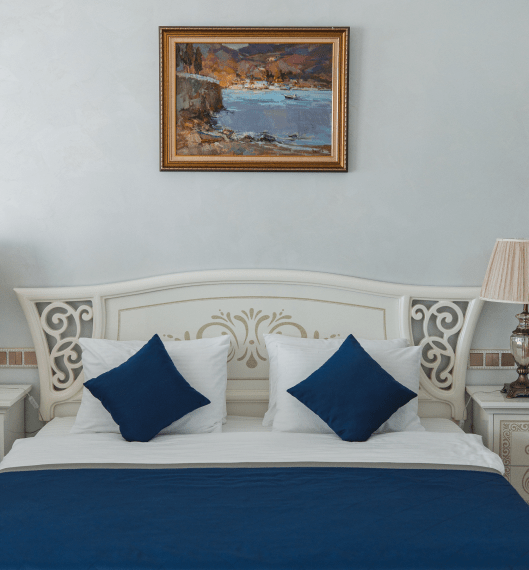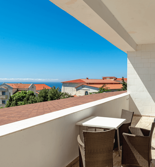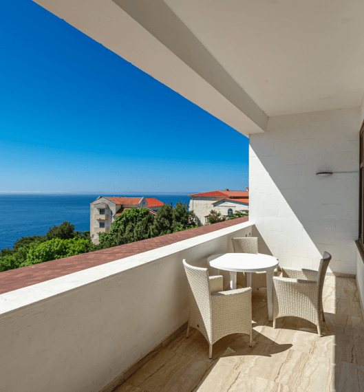 Люкс «Альбатрос» площадью 42 квадратных метра представляет собой двухкомнатное пространство, сочетающее уединение и функциональность для размещения до четырёх гостей. Отдельная спальня с двуспальной кроватью и гостиная зона с раскладным диваном (дополнительное место без возрастных ограничений) обеспечивают комфорт как для романтического отдыха, так и для пребывания небольшой семьи с детьми. Панорамные окна открывают вид на морскую гладь и живописный мыс Ай-Тодор, создавая атмосферу гармонии и спокойствия в течение всего дня. Продуманная планировка номера позволяет каждому гостю наслаждаться личным пространством без ущерба для общего комфорта проживания.