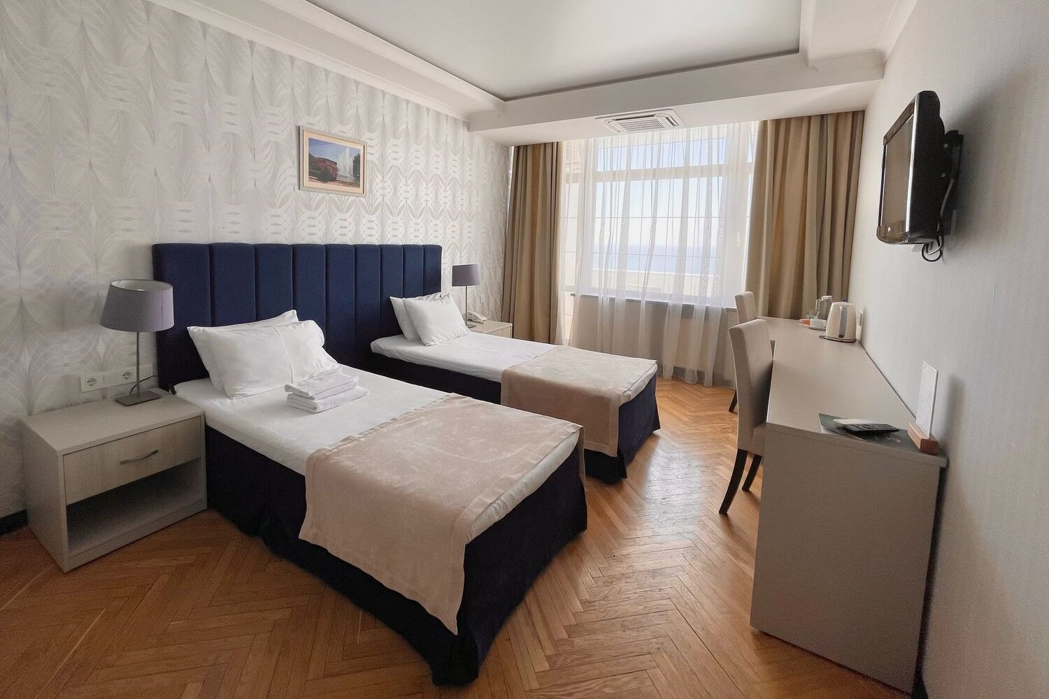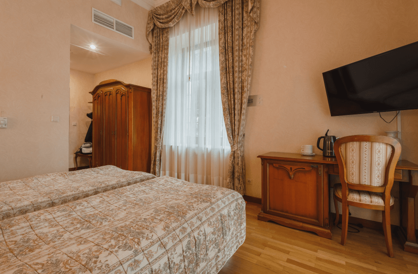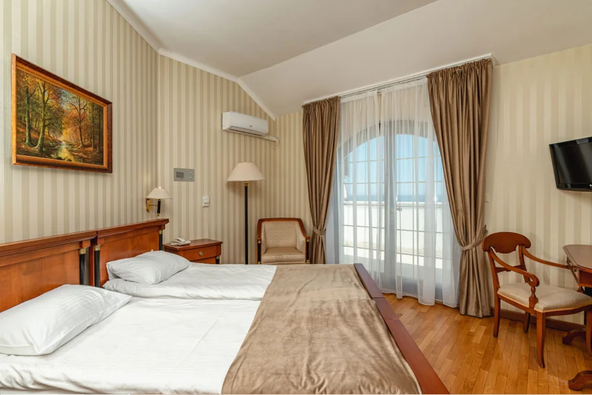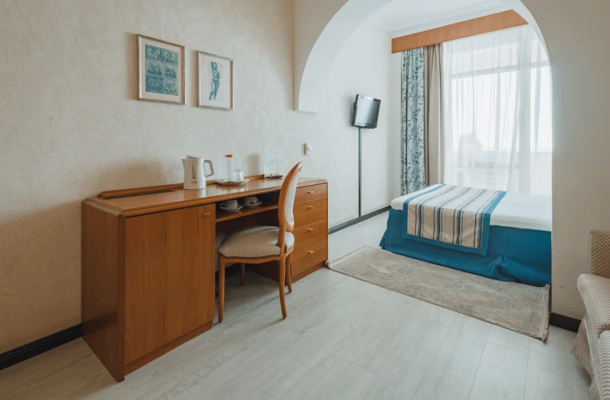 Расположенный на втором и третьем этажах первого корпуса, номер площадью 18 квадратных метров предлагает размещение на двух отдельных кроватях с возможностью установки евро-раскладушки для третьего гостя. Балкон с южной ориентацией открывает панораму парка «Чаир» и морских просторов. Обстановка включает итальянскую мебель: прикроватные тумбочки, туалетный и рабочий столы, вместительный платяной шкаф. Техническое оснащение представлено центральной системой кондиционирования, паркетным полом, мини-баром с холодильником, жидкокристаллическим телевизором, телефоном и электрочайником.
