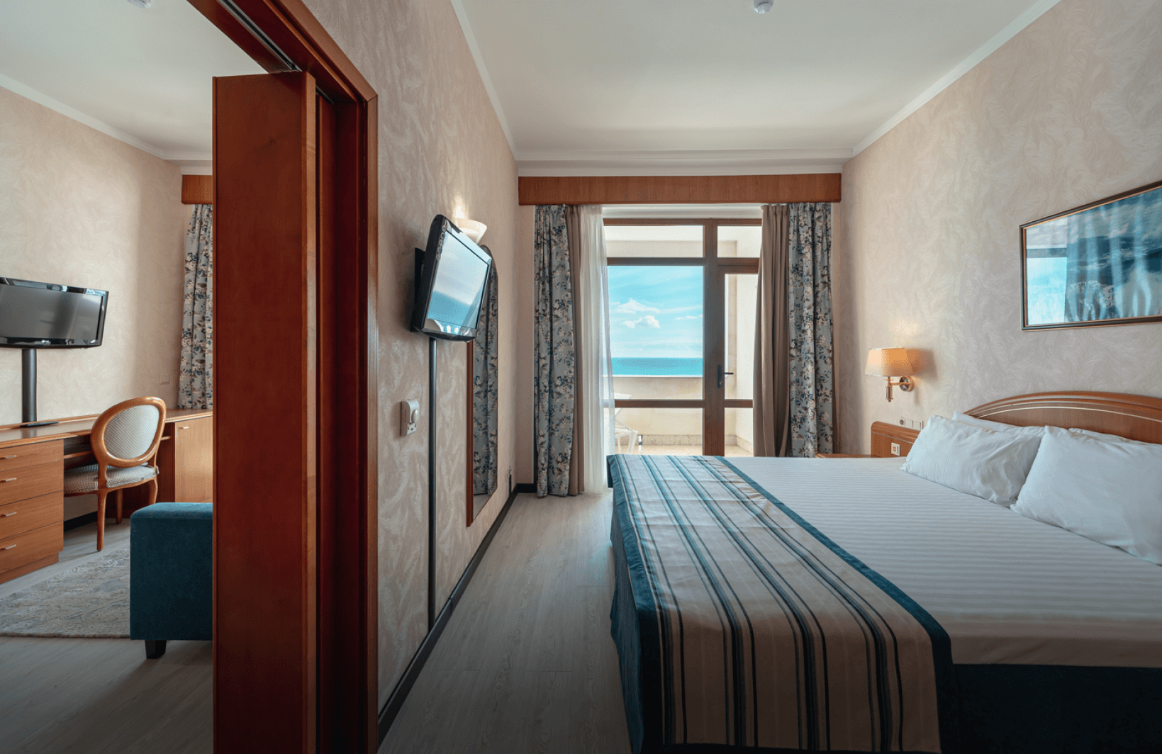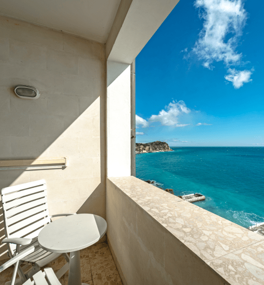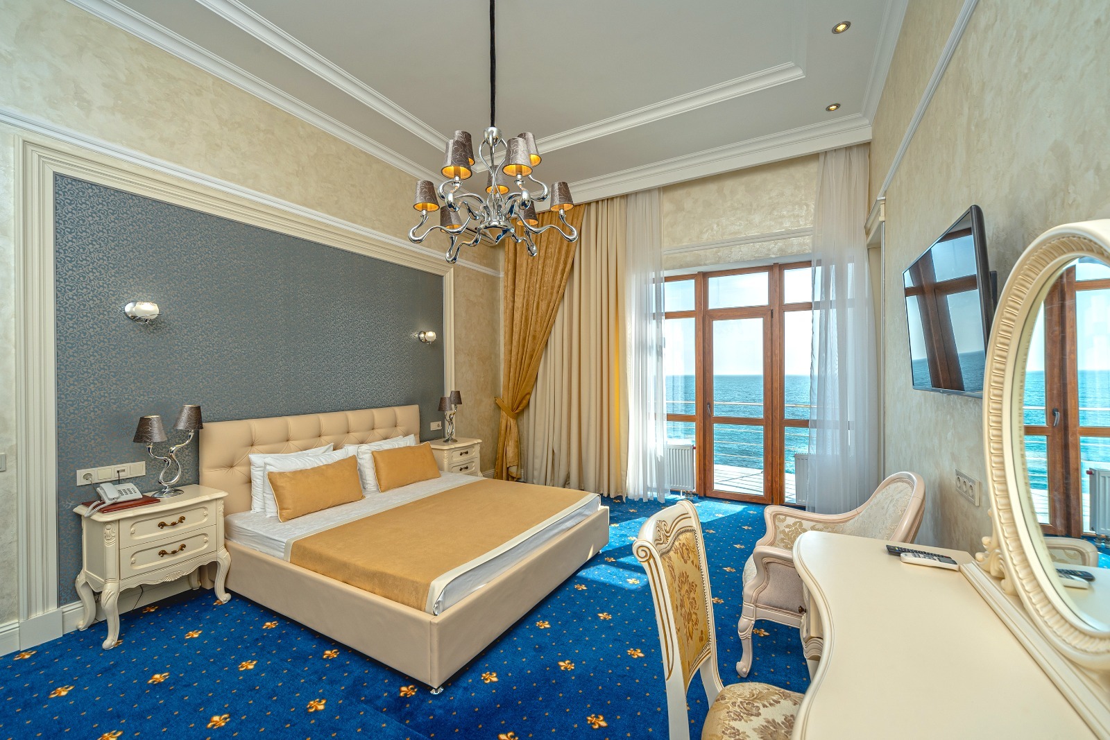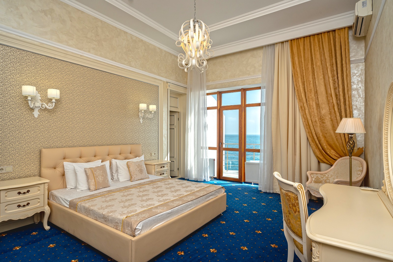 Просторный однокомнатный люкс обеспечивает размещение двоих гостей с возможностью дополнительного проживания двух взрослых на раскладном диване. Центральной частью интерьера выступает большая двуспальная кровать, дополненная парой прикроватных тумбочек и туалетным столиком. Отдельная гардеробная зона предоставляет достаточно пространства для хранения вещей. С балкона открывается живописная панорама морских просторов. Климат в помещении регулируется современной системой кондиционирования.