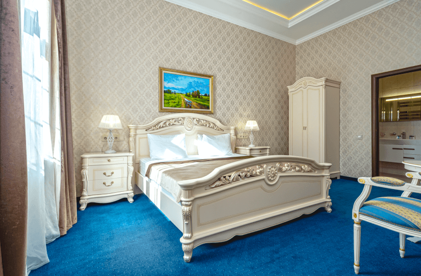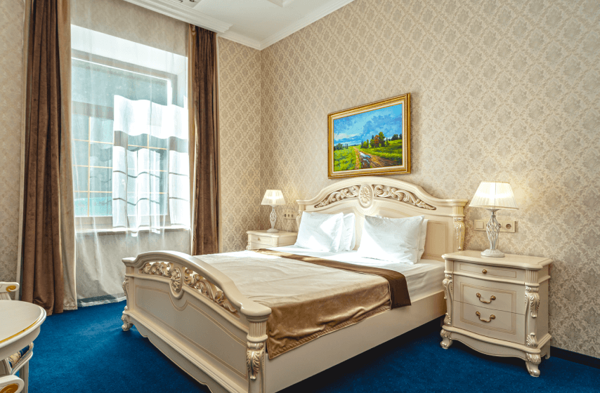 Двухкомнатный люкс площадью 45 квадратных метров расположен на четвёртом этаже первого корпуса и состоит из отдельной спальни и просторной гостиной. Спальная зона оборудована большой двуспальной кроватью, прикроватными тумбочками и туалетным столиком, гостиная включает два дивана (один раскладной), журнальный столик, набор посуды и электрочайник. Номер рассчитан на размещение до четырёх человек. Окна западной ориентации открывают вид на парк «Чаир». Интерьер дополнен индивидуальной системой кондиционирования, паркетным покрытием, мини-баром, телефоном и жидкокристаллическим телевизором; балкон отсутствует.