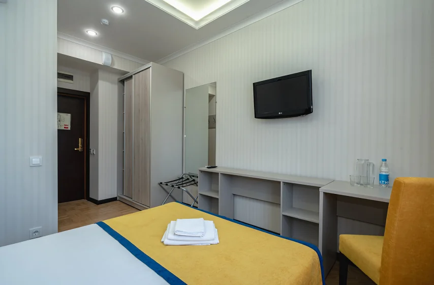 Компактный номер площадью 12 квадратных метров расположен во втором корпусе на этажах с четвёртого по седьмой и предназначен для размещения одного гостя либо матери с ребёнком до пяти лет. В интерьере предусмотрена односпальная кровать размером 140×200 см, мини-бар, электрочайник, телефон, жидкокристаллический телевизор и радио. Помещение оснащено индивидуальной системой кондиционирования, напольное покрытие выполнено из паркета. Окна ориентированы на северную сторону; балкон в номере отсутствует.