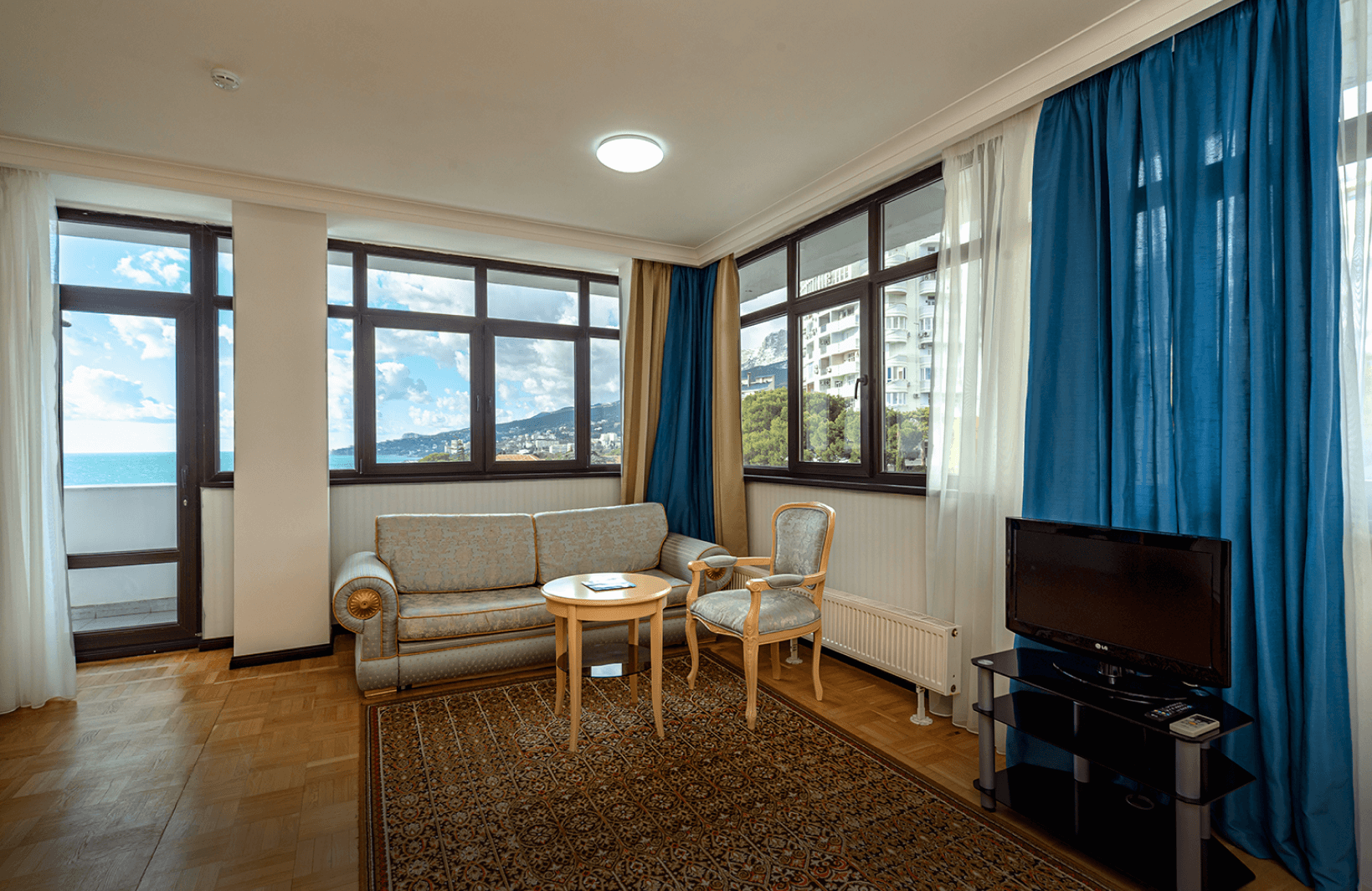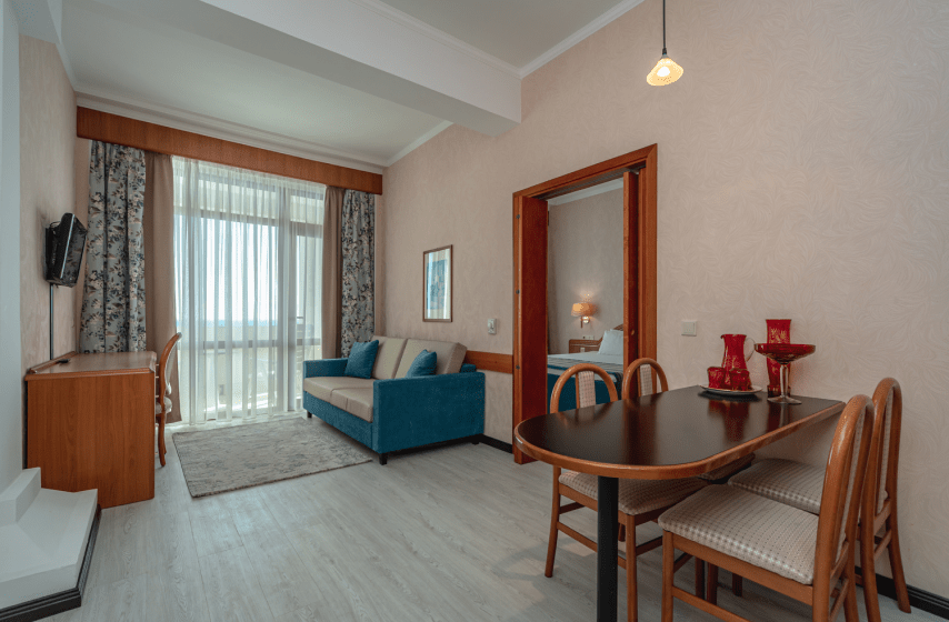 Двухкомнатный люкс площадью 42 квадратных метра на четвёртом этаже второго корпуса сочетает функциональность смежной планировки с панорамным остеклением южной ориентации. Двуспальная кровать в спальне дополняется парой прикроватных тумбочек и туалетным столиком, гостиная зона включает раскладной диван для дополнительных гостей, два кресла, сейф и обеденную группу с журнальным столиком. Комплект посуды и электрочайник обеспечивают самостоятельность приёма пищи. С балкона просматриваются зелёные насаждения парка «Чаир» и линия морского горизонта. Техническое оснащение представлено индивидуальным кондиционером, ламинатным покрытием, мини-баром, телефоном и парой жидкокристаллических телевизоров для каждой зоны номера.