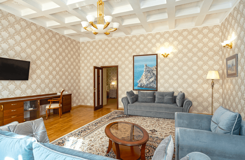 Просторный трёхкомнатный люкс площадью 98,8 квадратных метров на втором и третьем этажах первого корпуса рассчитан на размещение до шести гостей и идеально подходит для большой семьи. Две отдельные спальни с двуспальными кроватями, прикроватными тумбочками и туалетными столиками обеспечивают приватность, а гостиная зона с тремя диванами (два из которых раскладываются), сервантом, журнальным и письменным столиками создаёт пространство для совместного времяпрепровождения. Из окон западной ориентации открывается вид на парк «Чаир». Номер оснащён центральным кондиционированием, паркетным полом с ковровыми покрытиями, мини-баром, электрочайником, телефоном и двумя плазменными телевизорами; балкон отсутствует.